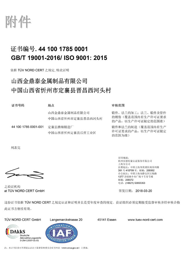 专业从事法兰,管件的生产和销售。公司获得ISO9001:2015质量体系的认证和德国TÜV颁发的PED证书,并严格按照此标准进行生产与管理。公司在中国上海,北京、太原设有分公司,并在世界各地签约多家国际代理商。产品主要销往美国,德国、沙特、意大利,巴西、俄罗斯、韩国等国家。